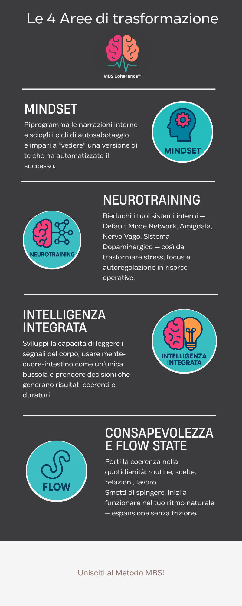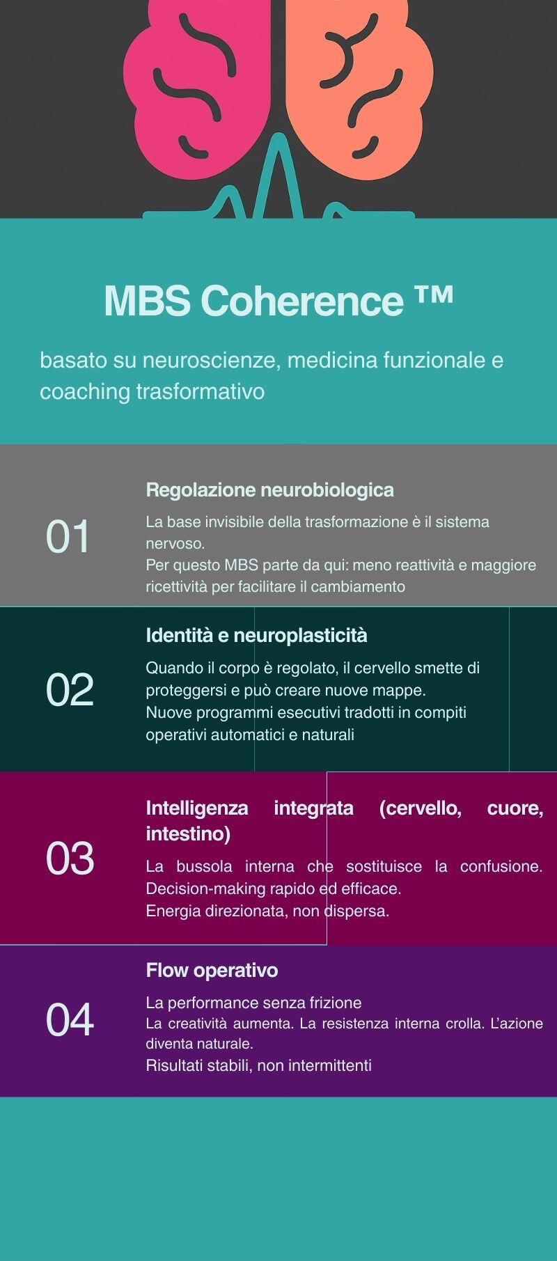 È un metodo nato da anni di studio, ricerca e applicazione reale, tra neuroscienze, medicina funzionale e coaching somatico. MBS Coherence™ allena il sistema a: